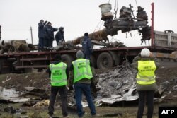 Another image of the Dutch recovery and export team watching as wreckage from Malaysia Airlines Flight 17, which was shot down over eastern Ukraine in July, killing all 298 people aboard, is loaded onto a truck for removal for investigation.